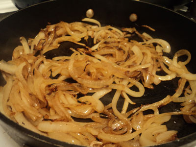 Divide onions in half. Heat oil in a large saute pan, and add half of the sliced onions once the oil is hot. Cook onions over medium low heat for 10-15 minutes, until caramelized (adding oil in small amounts if pan dries out). Repeat process with second batch of onions (alternatively, if you have two large saute pans you can do this step at once on two burners).